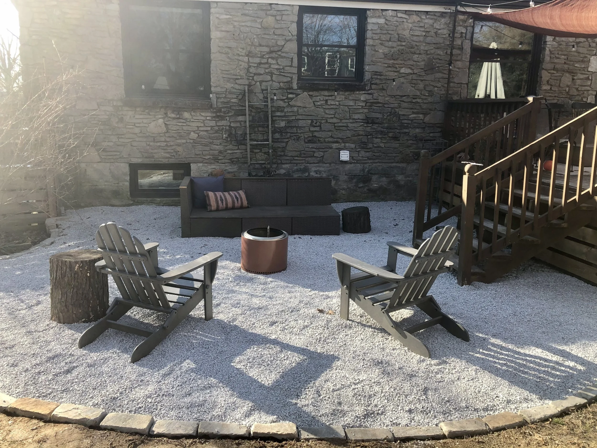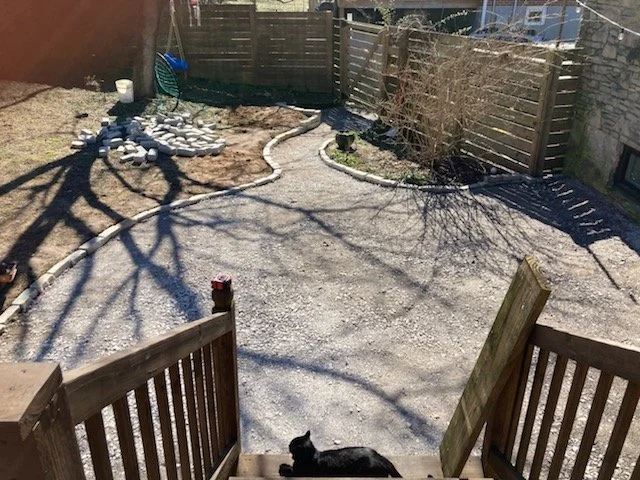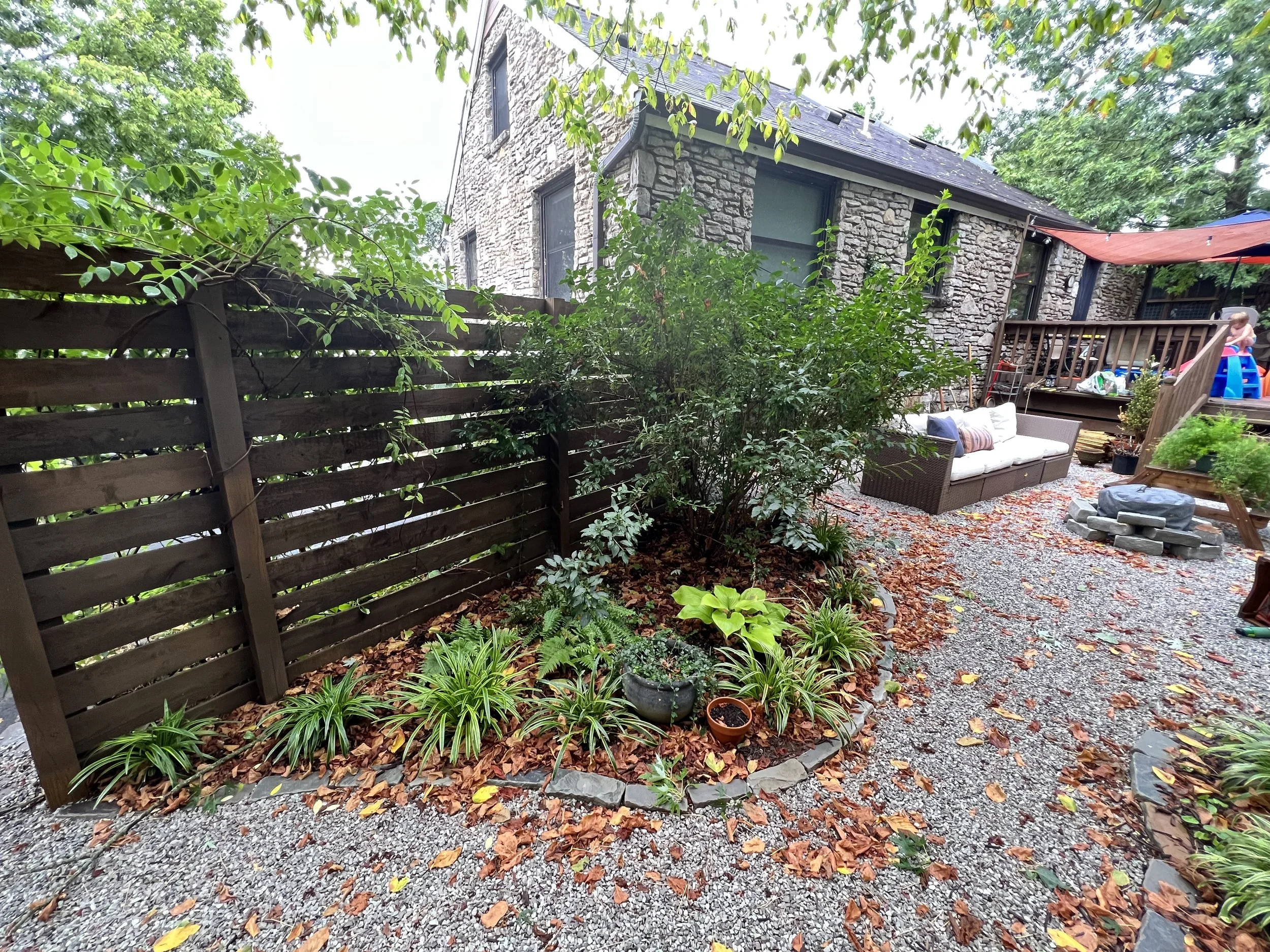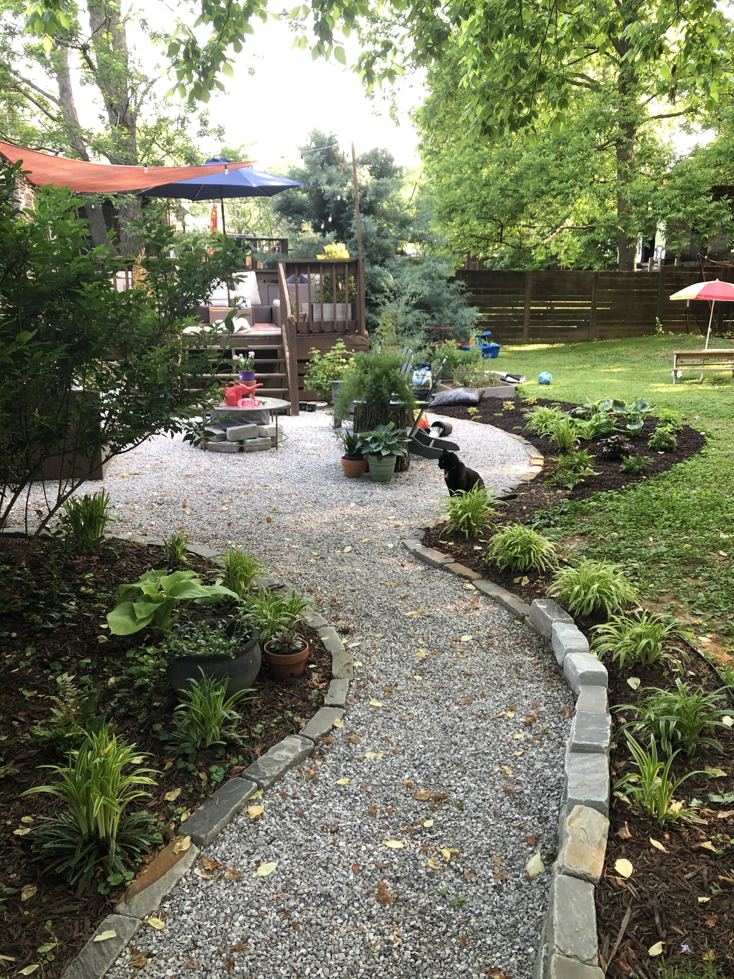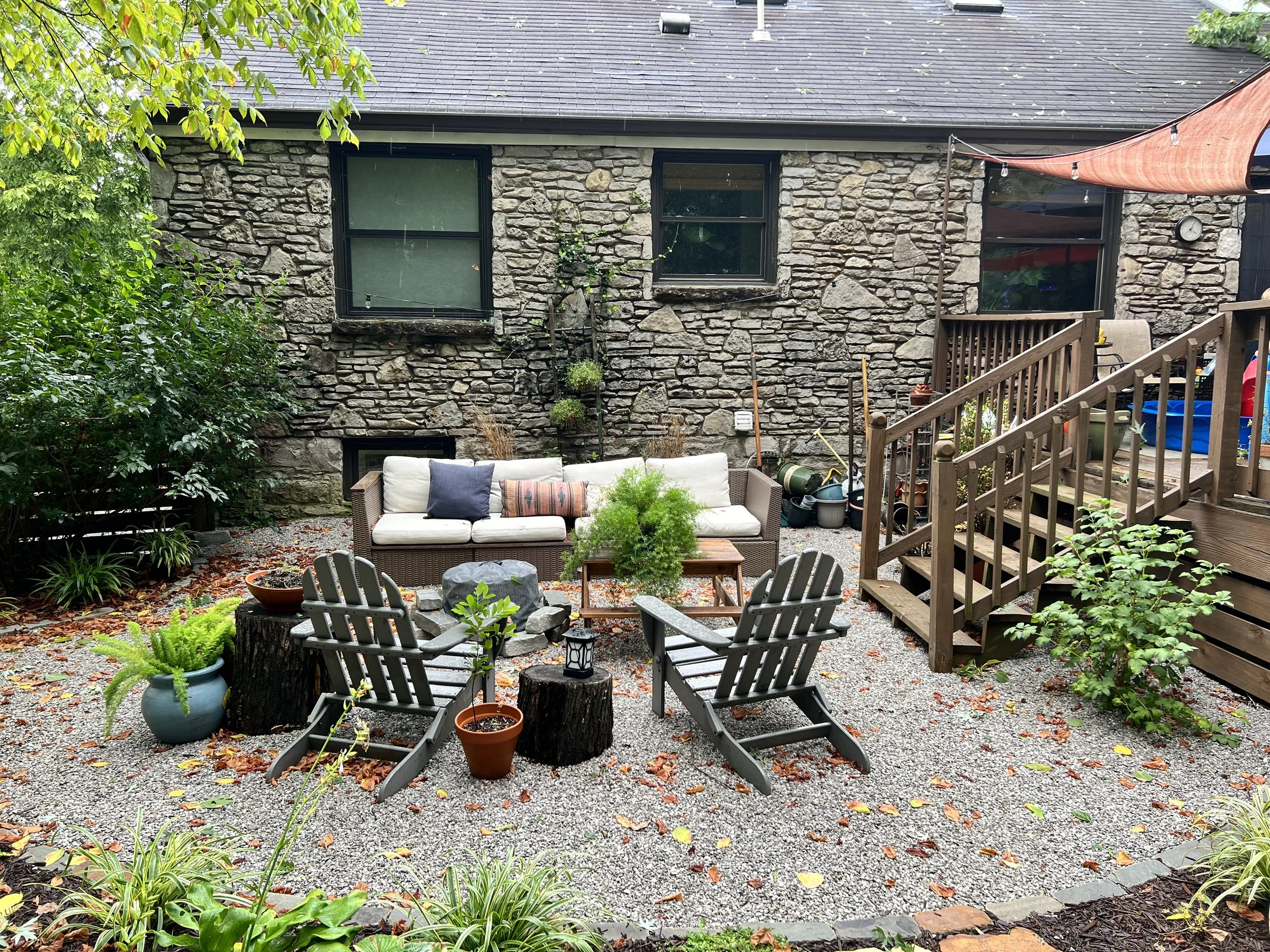 The gravel patio serves as a practical and low-maintenance area for seating with privacy, providing a seamless transition from the garden to the deck. Gravel lined with cobblestone is a perfect patio choice for any homeowner looking to enhance their landscape with beauty and functionality themselves. My husband and I also installed a french drain and some grading to keep water away from the house.