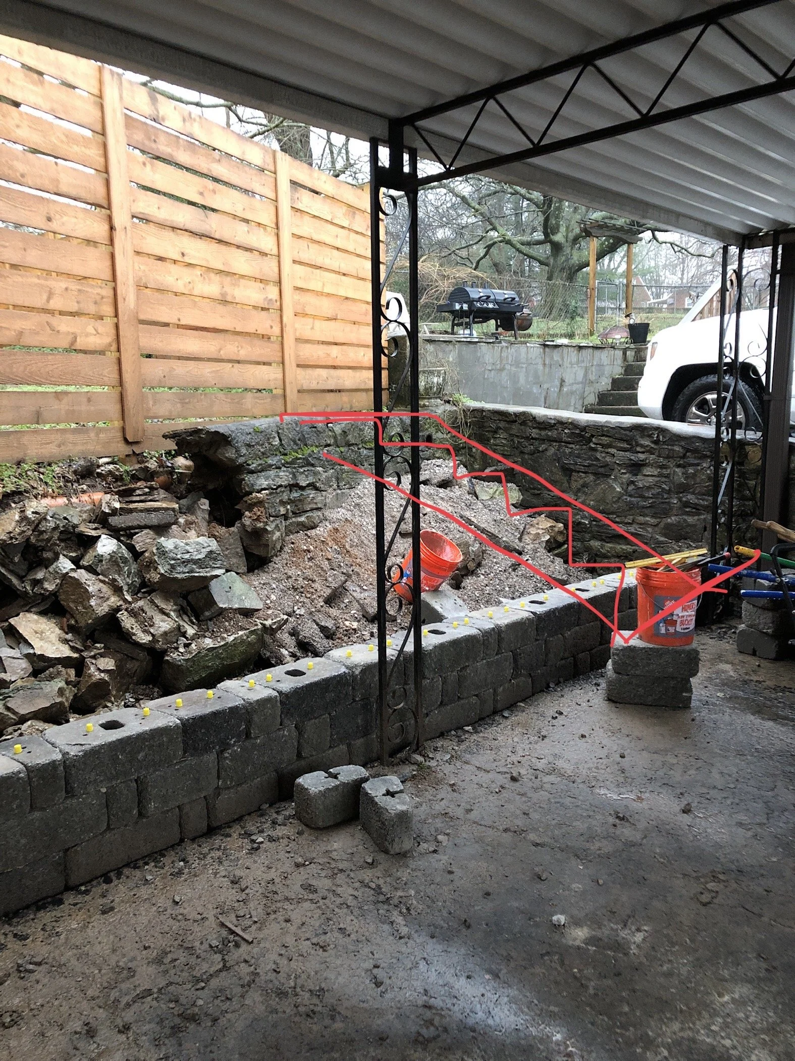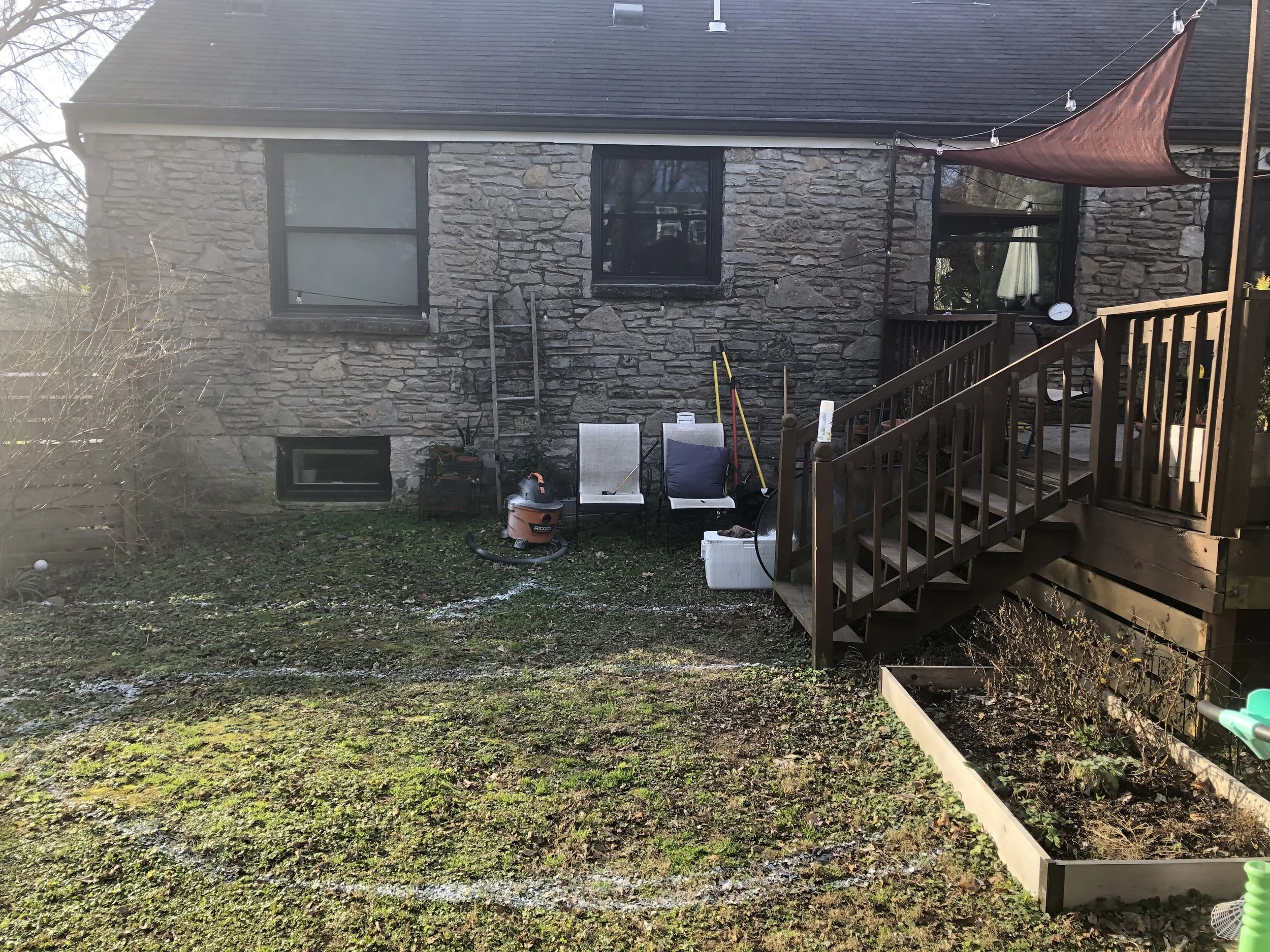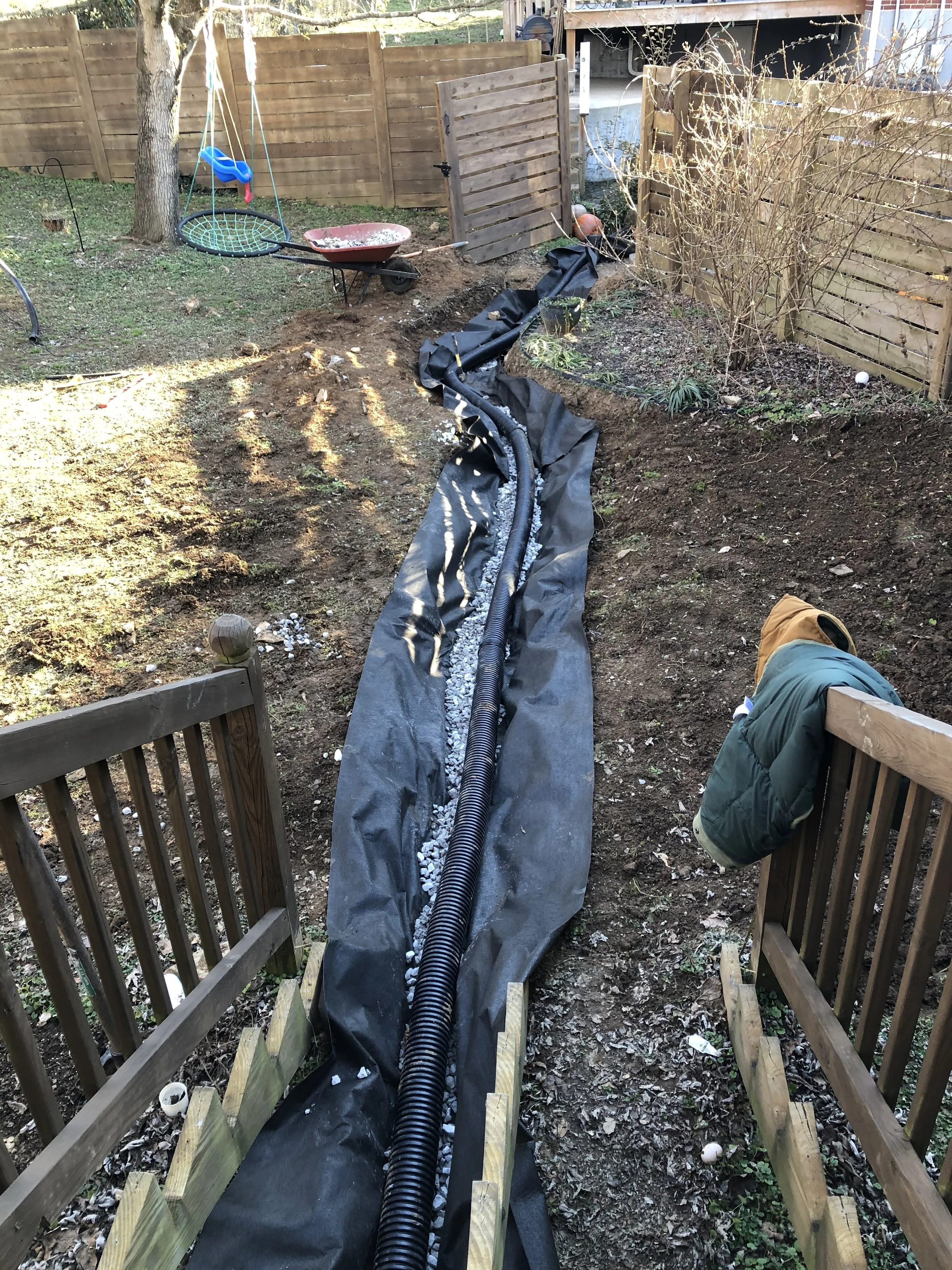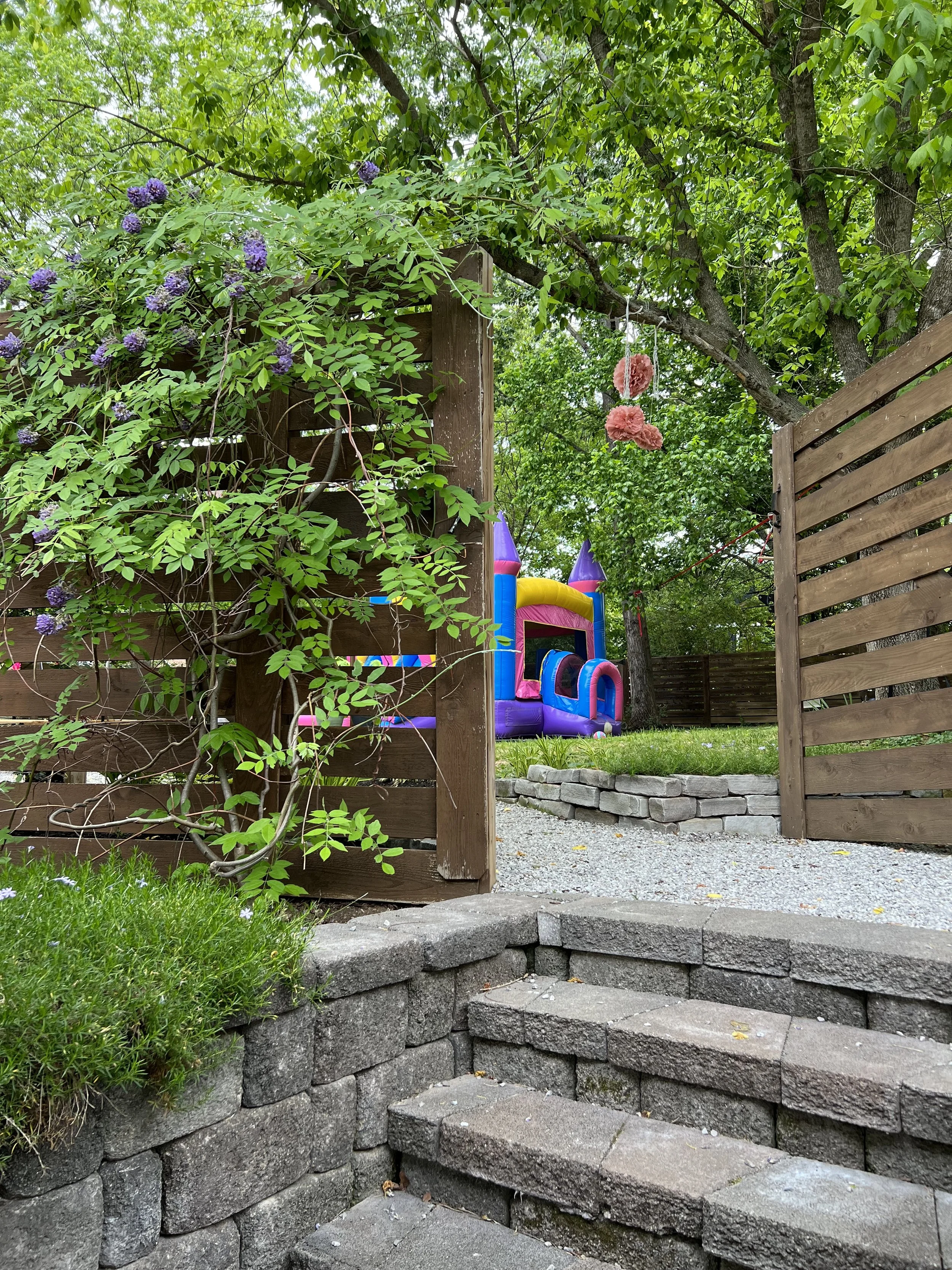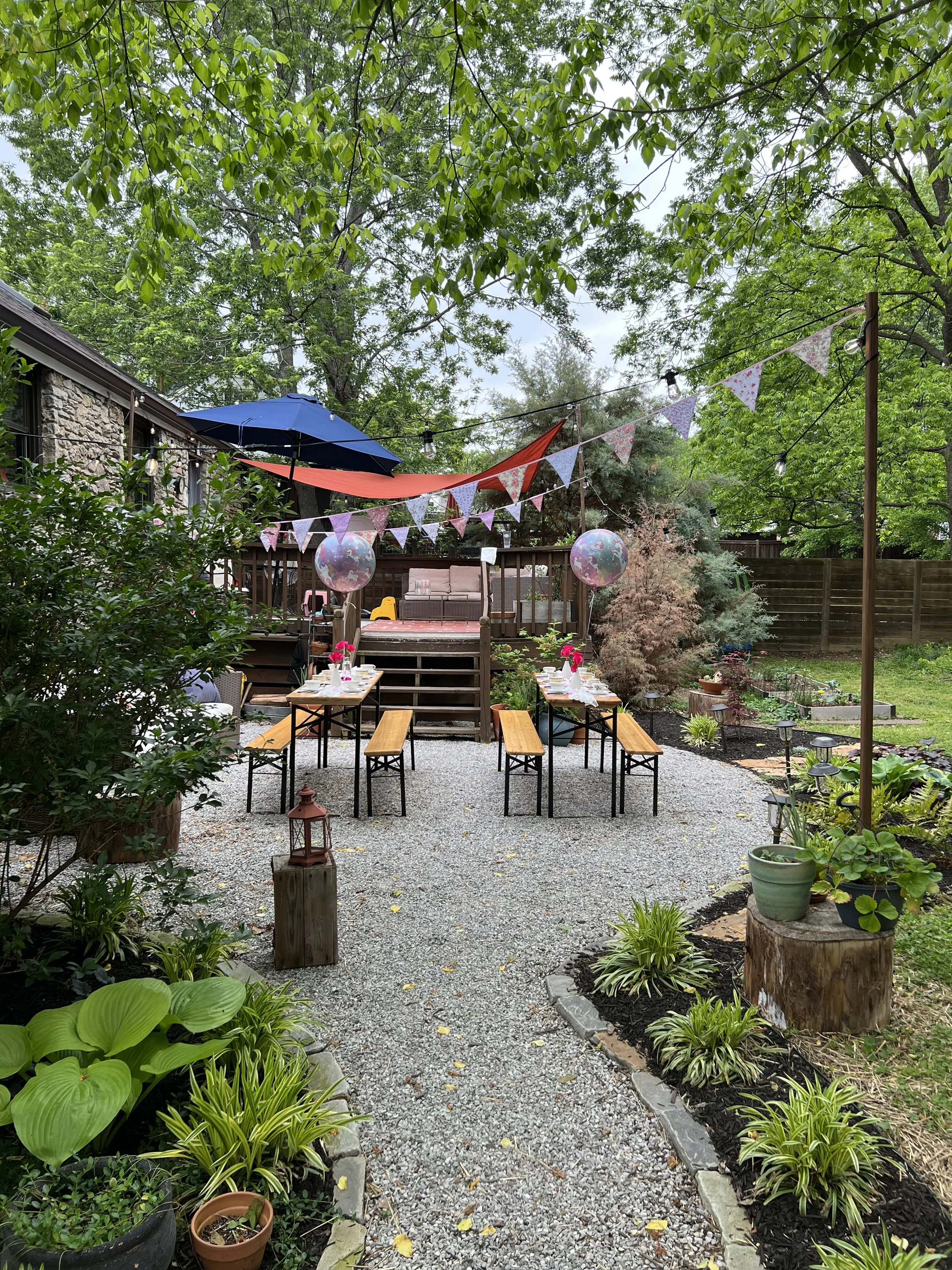 The gravel patio serves as a practical and low-maintenance area for seating with privacy, providing a seamless transition from the garden to the deck. Gravel lined with cobblestone is a perfect patio choice for any homeowner looking to enhance their landscape with beauty and functionality themselves. My husband and I also installed a french drain and some grading to keep water away from the house.
